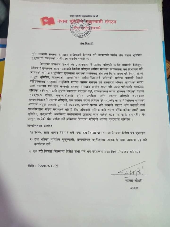 संगठनकी अध्यक्ष शान्ता चौधरीले आज एक विज्ञप्ती निकाल्दै आन्दोलनका कार्यक्रमहरु सार्वजनिक गरेकी हुन् ।