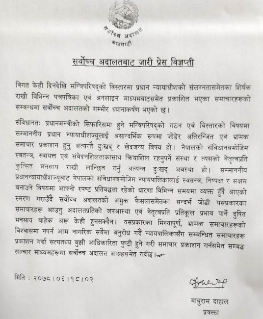 सर्वोच्चले जारी गरेको विज्ञप्तिमा ‘संविधानतः प्रधानमन्त्रीको सिफारिसमा हुने मन्त्रिपरिषद गठन एवं विस्तारको विषयमा सम्माननीय प्रधान न्यायाधीशज्युलाई असान्दर्भिक रुपमा जोडेर अतिरन्जित एवं भ्रामक समाचार प्रकाशन हुनु अन्तन्तै दुःखद् र खेदजन्य विषय हो,’ भनिएको छ, ‘नेपालको संविधान बमोजिम स्वतन्त्र, स्वायत्त एवं संवेदनशिलताका साथ क्रियाशील रहनुपर्ने संस्था र त्यसको नेतृत्वप्रति कुत्सित मनसाय राखी लान्छित गर्नु अत्यन्त दुःखद् अवस्था हो।’